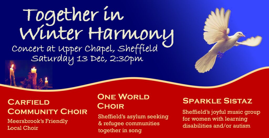 started 18 years ago, originally based at Carfield School in Meersbrook. Nowadays it meets weekly at the Church of the Nazarene in Heeley. The choir is open to everyone, there are no auditions, and the emphasis is on the joy of making music together. However the choir has some notable achievements, including leading these annual winter concerts and Carfield was one of three Sheffield Choirs working together to organise the national Street Choirs Festival, when it came to our city in 2024.